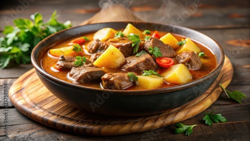 Close-up of beef goulash with potatoes in a bowl, steaming hot, simmering sauce, steaming hot