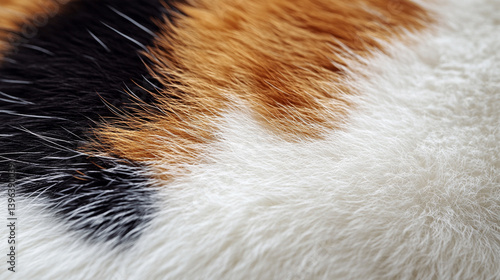 Close-up of calico or tortoiseshell cat fur texture, showcasing the intricate patterns and vibrant colors of pet hair, symbolizing comfort, warmth, and the beauty of natural animal coats.