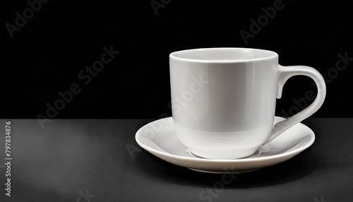 Close-up of ceramic white cup on isolated black background. Tea or coffee mug. Drink ware. Mock up.