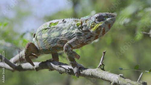 Closeup of Chameleon sits on a tree branch and looks around during molting. Panther chameleon (Furcifer pardalis).