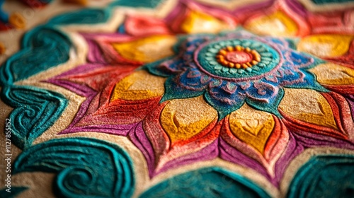Close-up of Colorful Sand Mandala Art Displaying Intricate Patterns