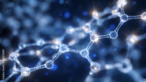 Close-up of complex molecular lattice, atoms linked by glowing bonds, subtle reflections on smooth surfaces, futuristic scientific visualization