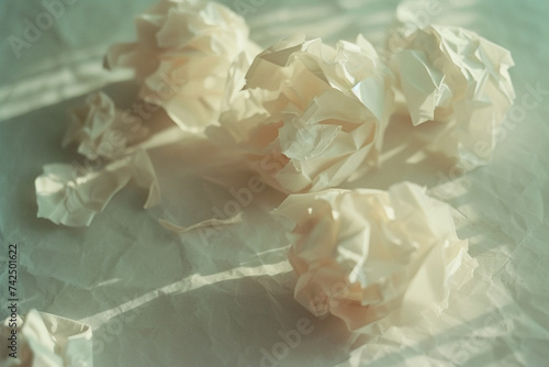 Close-up of crumpled paper balls scattered across a minimalist workspace, with clean lines and muted tones enhancing the simplicity and beauty of the scene, Japanese minimalistic s
