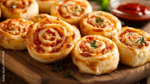 Close-up of delicious pizza rolls on a wooden board with a small dish of tomato sauce.