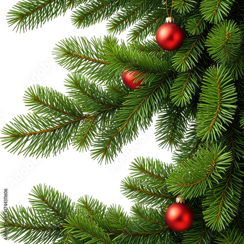 Close-up of fir tree branches with red ornaments, isolated on black background