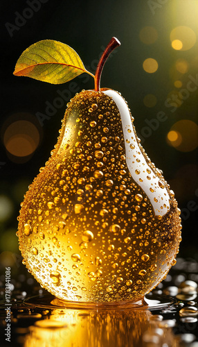 Closeup of fresh pear with water droplets and green leaf on dark background