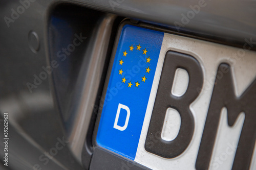 close-up of German number plate showing D for Germany and the stars banner of European Union