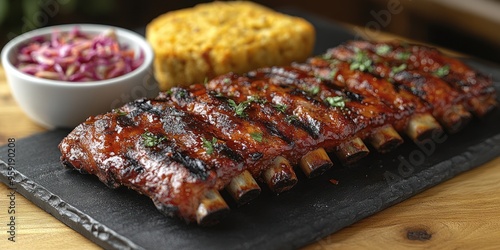 Close-Up of Glazed BBQ Ribs with Side Dish and Cornbread