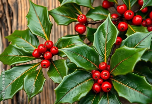 Close-up of glossy holly leaves and red berries against a rustic wood background, macro, winter