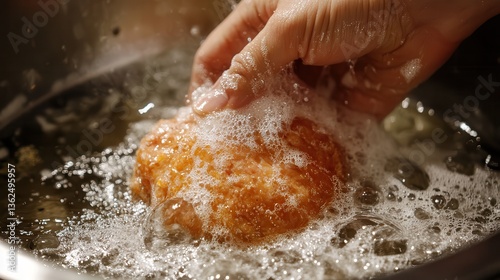 Close-up of hand cleaning kitchen sink