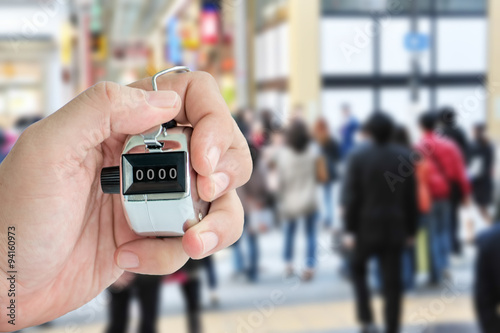 closeup of hand handle tally counter counting number of people in marketing survey job