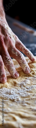 Close-up of hand kneading dough, dusted with flour, on a wooden surface.