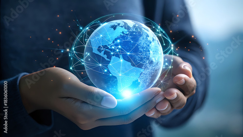 Close-up of hands holding a glowing holographic globe representing global technology and innovation, futuristic blue tones