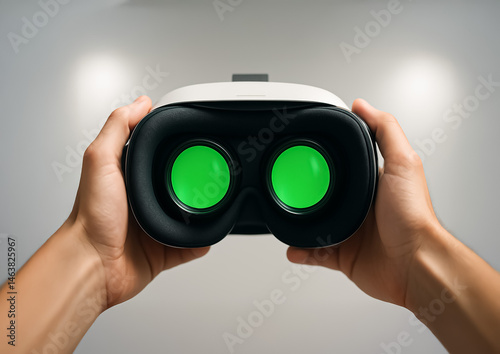Close-up of hands holding VR goggles with bright green lenses, depicting technology interface and immersive simulation concept in clean setting.