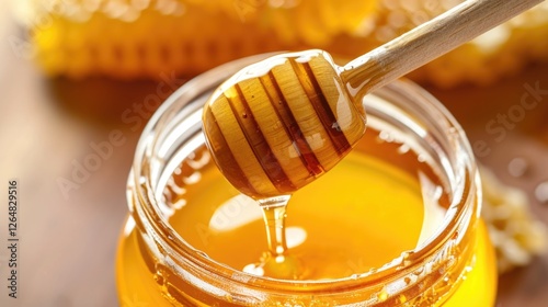 Close-up of honey dripping from a wooden dipper