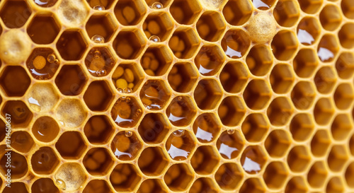 Closeup of Honeycomb Cells Filled with Honey and Pollen.