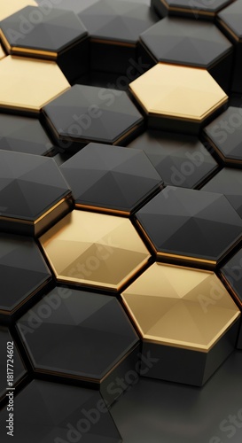 Closeup of interlocking black and gold hexagonal tiles with reflective surfaces and faceted tops