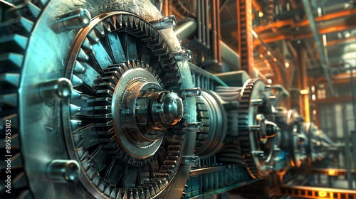 Close-up of intricate industrial machinery with gears and metal components, showcasing mechanical engineering details in a factory setting.