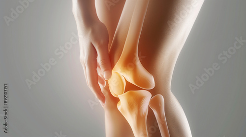 Close-up of knee pain, with focus on the inside part where it feels sharp when touched, highlighting the joint or bone structure. The background is plain white to emphasize the hum