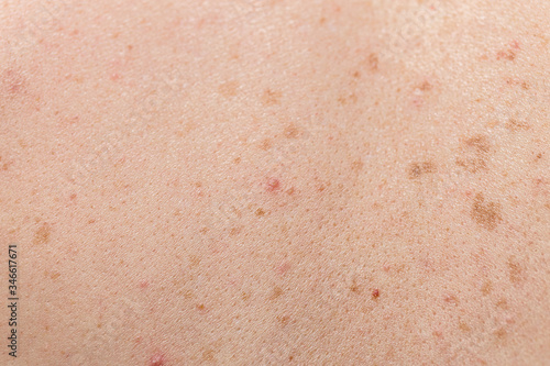 Close-up of large rashes or smallpox on the skin of an adult male. Pigmented spots on the back of a man. Skin of a man with moles. Acne.