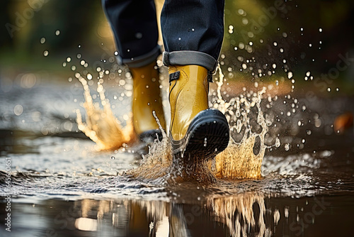Close-up of legs of person in wellington boots splashing in rain puddles