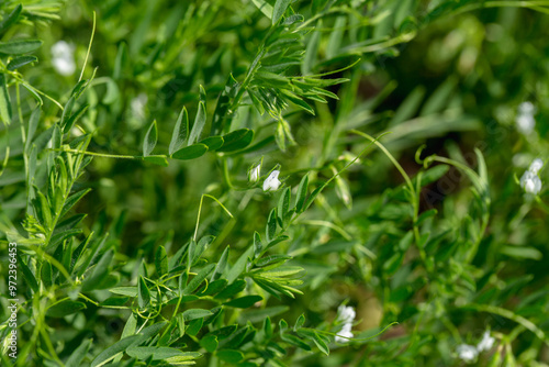 Close-up of lentil plant with white flowers. Lentil field. Detail of flowers and tendrils on a green background