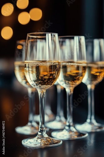 Close-up of multiple glasses filled with sparkling white wine against a dark background with soft golden bokeh lights creating a festive and elegant atmosphere