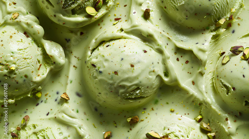 Close-up of multiple scoops of pistachio ice cream adorned with small pieces of pistachio nuts. Ideal for highlighting rich, nutty frozen desserts and gourmet food presentations.