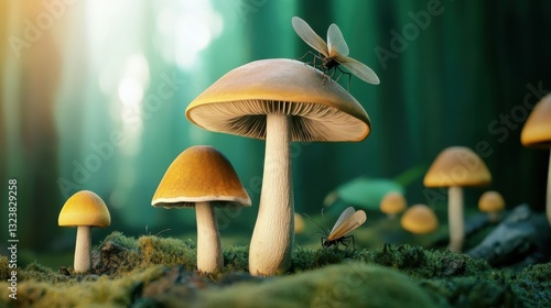 Closeup of Mushrooms and Insects in a Lush Green Forest