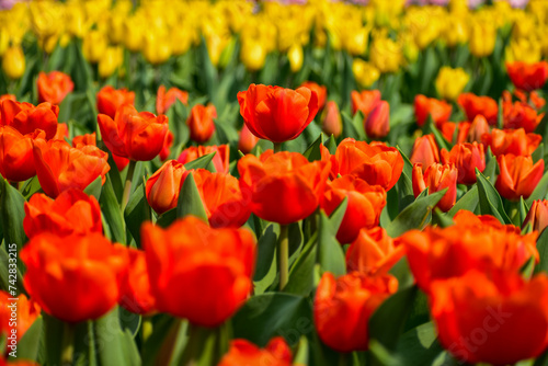 Close-up of orange tulips in the sea of tulips in daytime. Flower and plant. For background, nature and flower background.