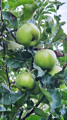 Close-up of organic green apples growing on apple tree, in orchard.