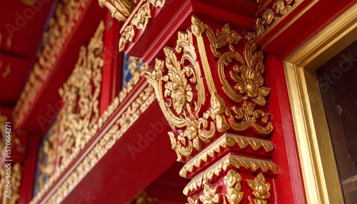 Close-up of ornate red and gold temple architecture with intricate carvings