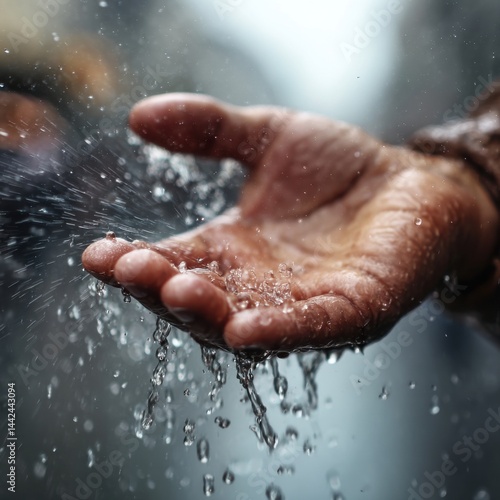 Close-Up of Outstretched Hand Capturing Rain Drops with Water Splashes in an Urban Environment on a Gloomy Day