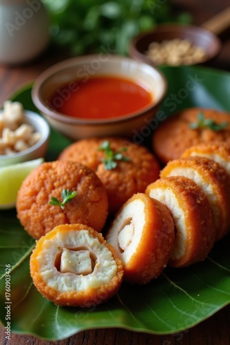 Close-up of Pempek fish cakes sliced open, revealing moist fish-tapioca filling under a vibrant red tamarind sauce