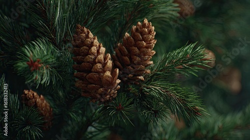 Close-up of pine cones on a branch.