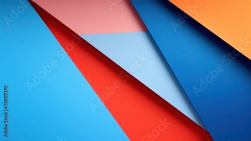 Closeup of pink blue rose orange and red paper cut style composition with layers or 3d gradient of geometric shapes and lines in shades. Top view. For web design