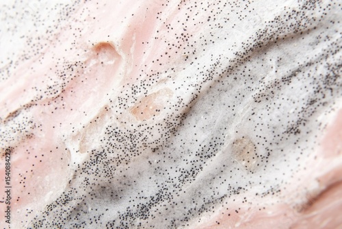 Close-up of pink flesh covered with white cream and black poppy seeds, creating a textured surface.