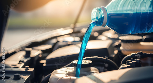 Close-up of pouring blue windshield washer fluid into a car's reservoir during vehicle maintenance.