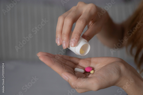 Close-up of pouring pills in hand with blurred bedroom background. Illness, therapy, sickness concept.