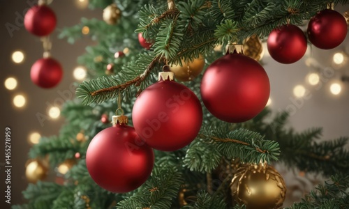 Close-up of red and gold baubles on a Christmas tree branch, image, needle