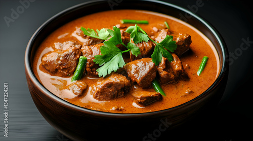 Closeup of Red Beef Curry in Brown Bowl on Dark Background