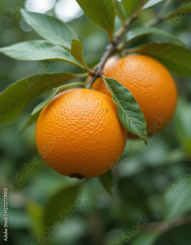 Close-up of ripe oranges hanging from a tree branch with deep green leaves, illuminated by soft natural sunlight.