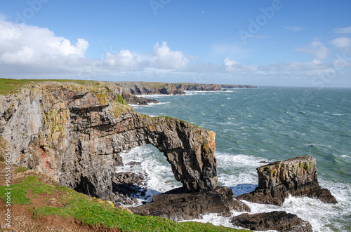 Close-up of rocky sea stacks in Wales being lashed by ocean waves.