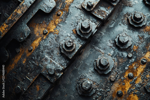 Close-up of rusty metal with bolts, showcasing a detailed texture of aged industrial metal.