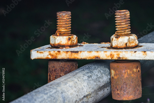 Close-up of rusty on nut and bolt isolated of metal roller, Roller suport steel door, Selective focus.