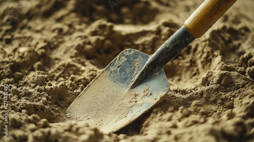 Close-up of Shovel in Sand - A Detailed View of Construction Material