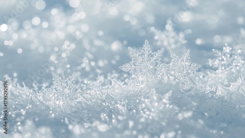 Close-up of snowflakes with sparkling bokeh effect, winter, cold, frost, ice crystals, frozen, seasonal, holiday, nature, macro.