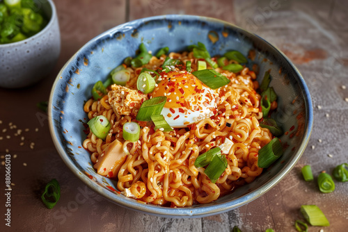 Close-up of spicy ramen instant noodles, cheap food