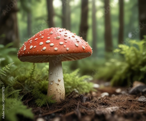 Close-up of spotted toadstool in soft focus forest setting, dreamy, vibrant, whimsical, fungi