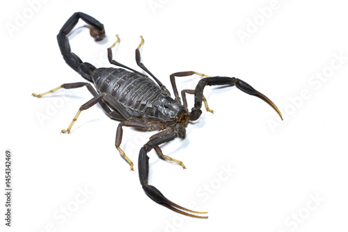 Closeup of the Black Deathstalker scorpion Leiurus nigellus, a remarkable new buthid species from Saudi Arabia, photographed on white background.